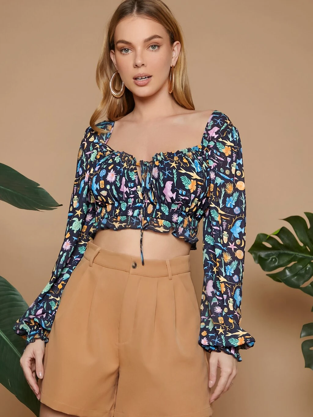 Tropical Print Knot Shoulder Puff Sleeve Ruched Bust Crop Top