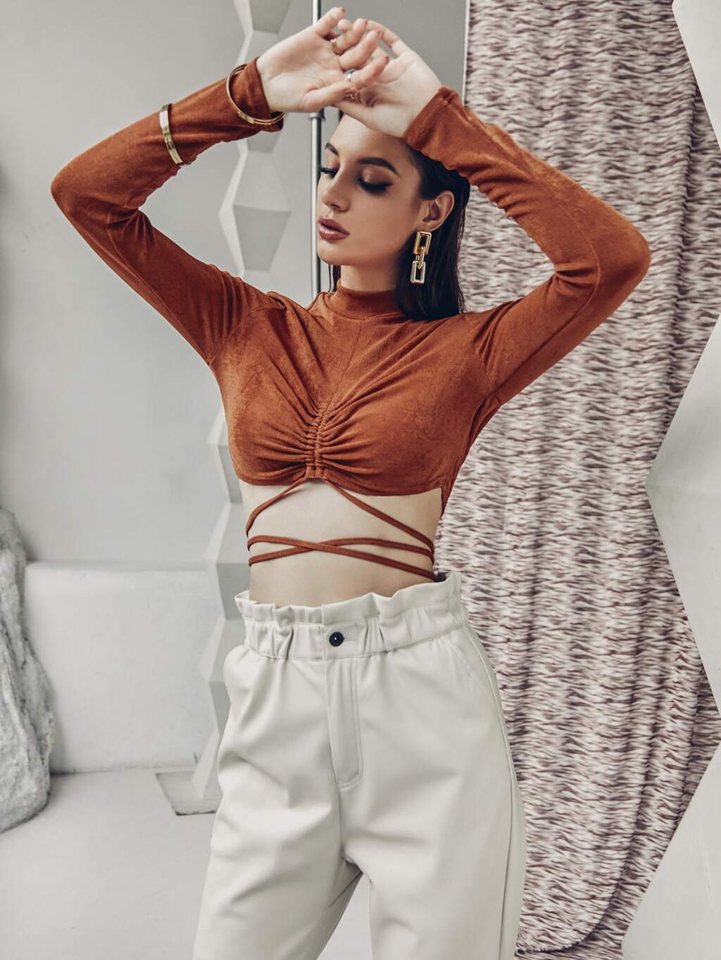 Two Tone Tie Backless Puff Sleeve Crop Top