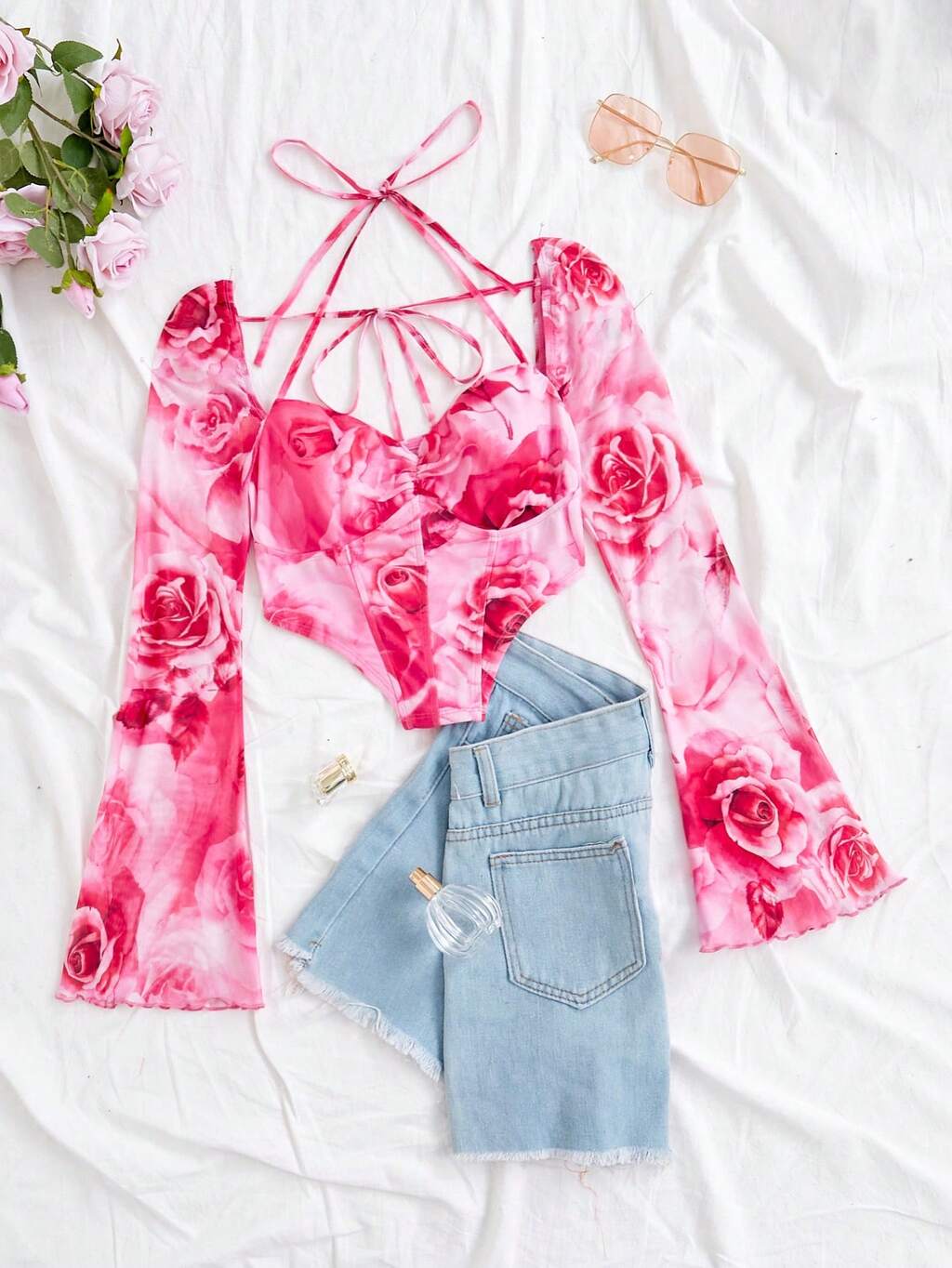 Women's Floral Print Bell Sleeve Halter T-Shirt