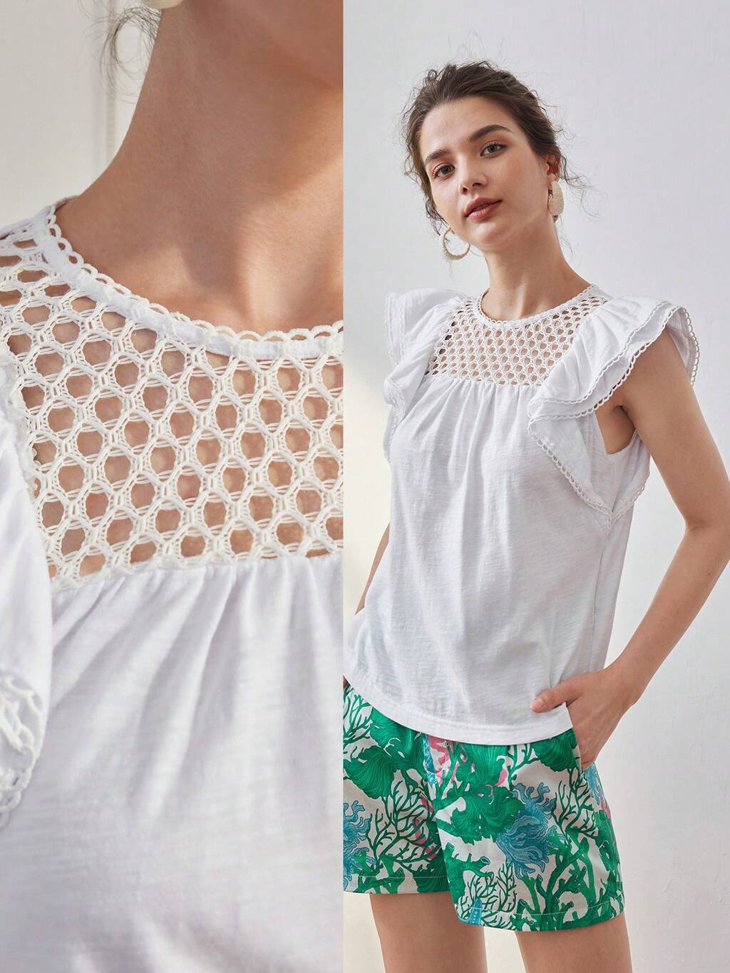 Women's Summer Scoop Neck Cap Sleeve Lace Insert Crop Sexy T-Shirt