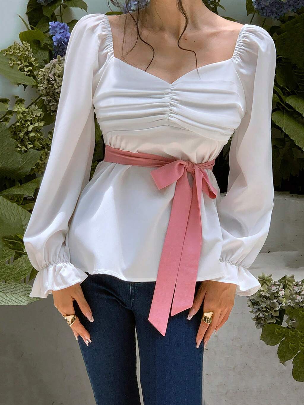 Sweetheart Neck Flare Sleeve Ruched Belted Blouse Fall Cloth For Women