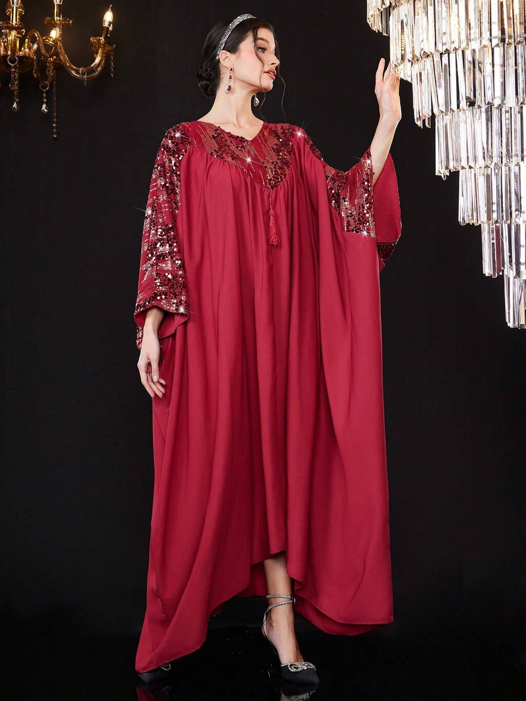 Burgundy Red Women's Kaftan With Glitter Patchwork And Tassel Decoration