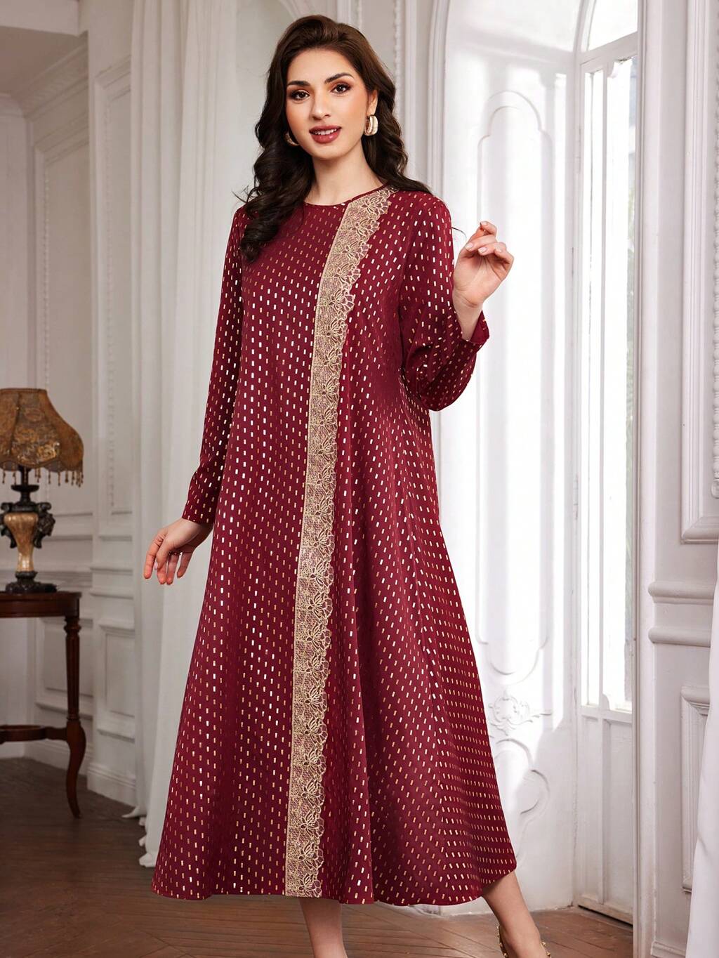 Burgundy Red Women's Arabian Style Gold Foil Printed Dress