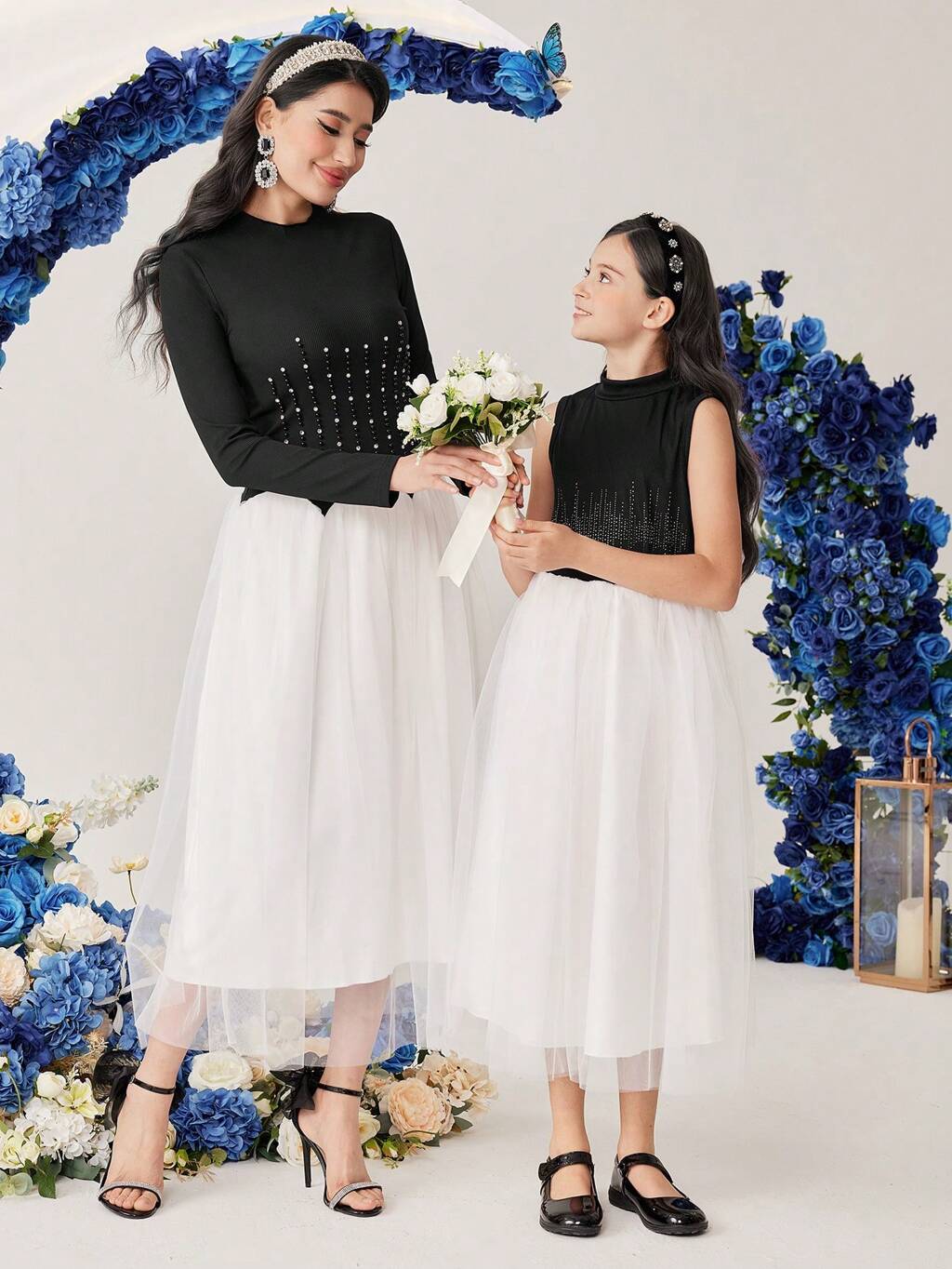 Girls' Elegant And Black & White Sequined Mesh Top With Princess Tulle Skirt, Lace & Floral Two Pieces Set, Suitable For Banquet, Wedding, Party, Spring And Summer