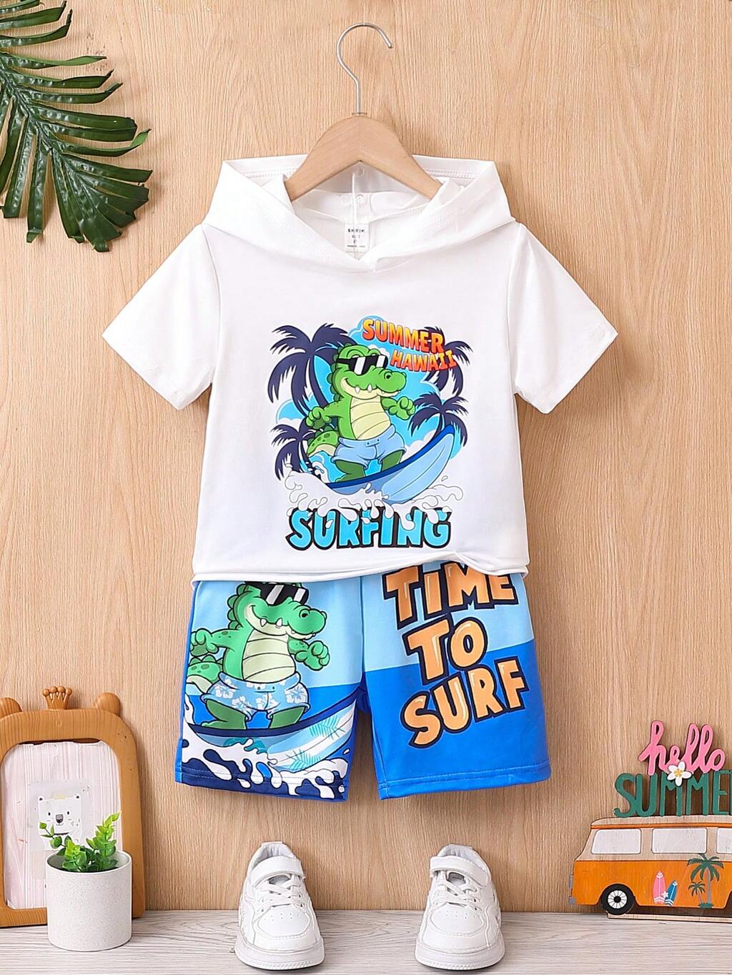 2pcs/Set Young Boy Casual Dinosaur Cartoon English Letter Hooded Short Sleeve Top And Cute Dinosaur & Letter Print Shorts, Suitable For Daily Wear, School, Vacation And Sports, Spring & Summer