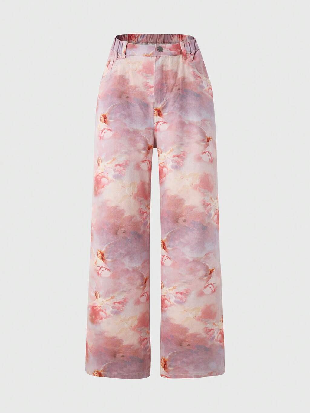 Teenage Girls' Y2k Sweet & Cool Pink Angel Printed Comfortable High Waist Wide Leg Jeans With Elastic Waistband