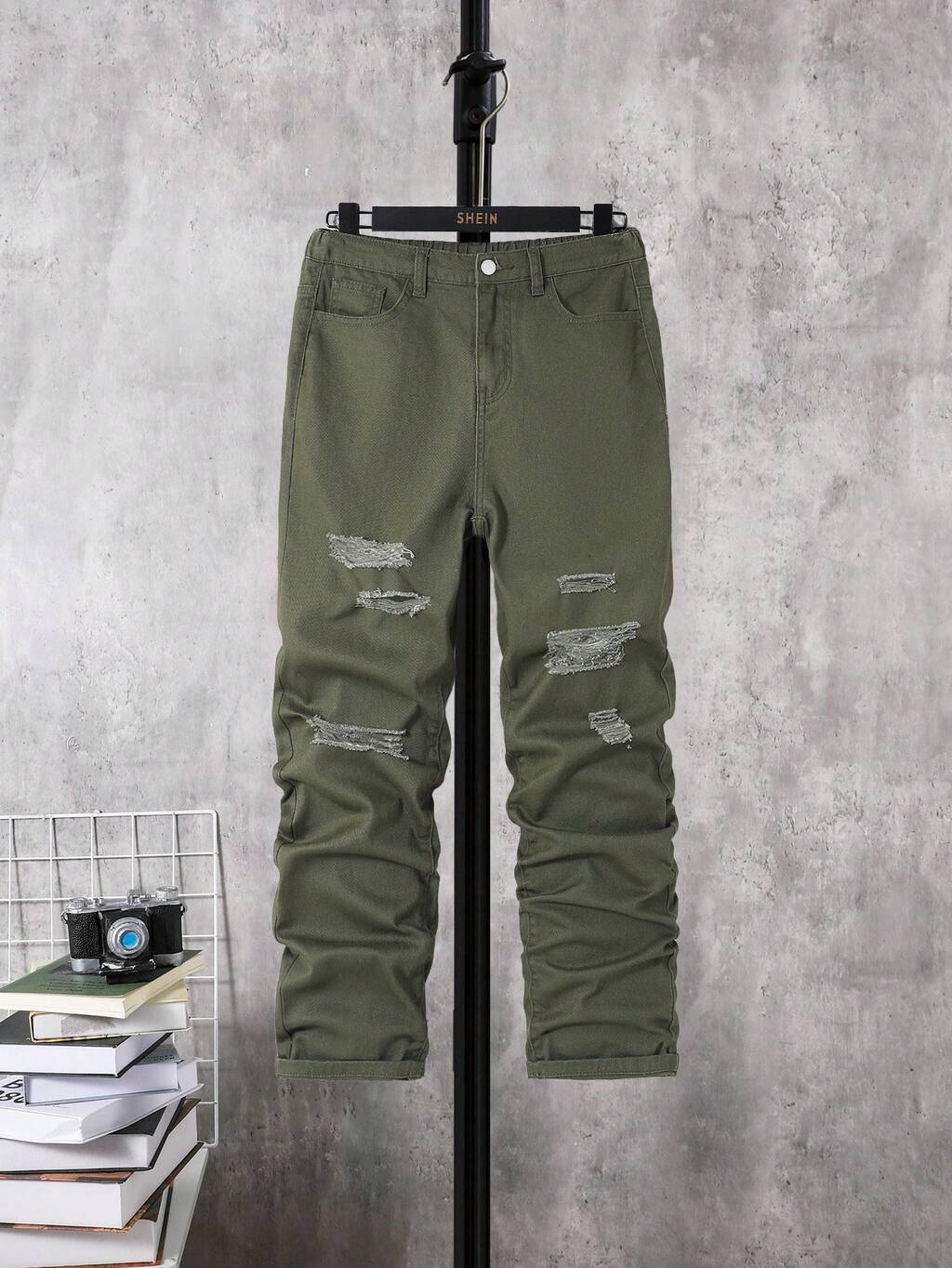 Teen Boys' Ripped Frayed Straight Leg Green Denim Jeans,For Summer