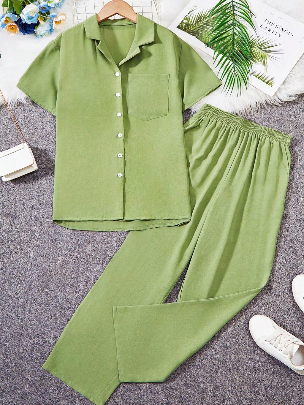 Teen Boys' Solid Color Turn-Down Collar Shirt And Pants Set
