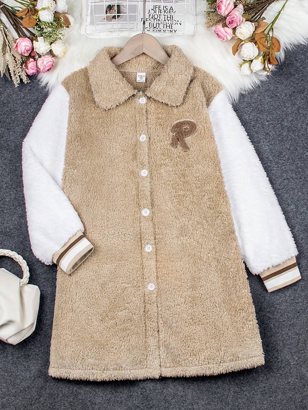 Girls' Long Sleeve Plush Buttoned Coat With Letter Embroidery And Color Block Design