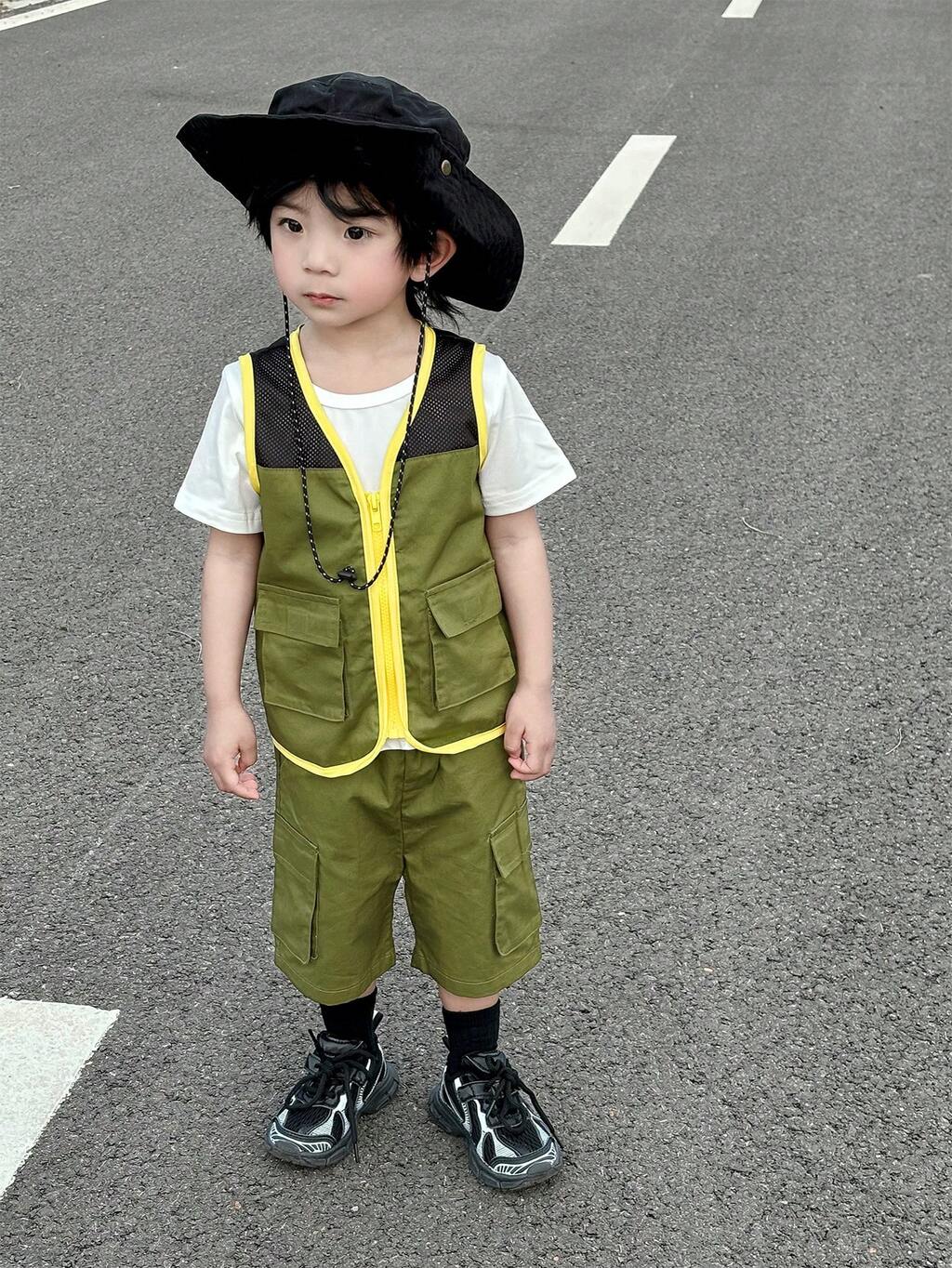 Outdoor Baby Workwear Casual Pocket Patchwork Vest Jacket And Shorts Set