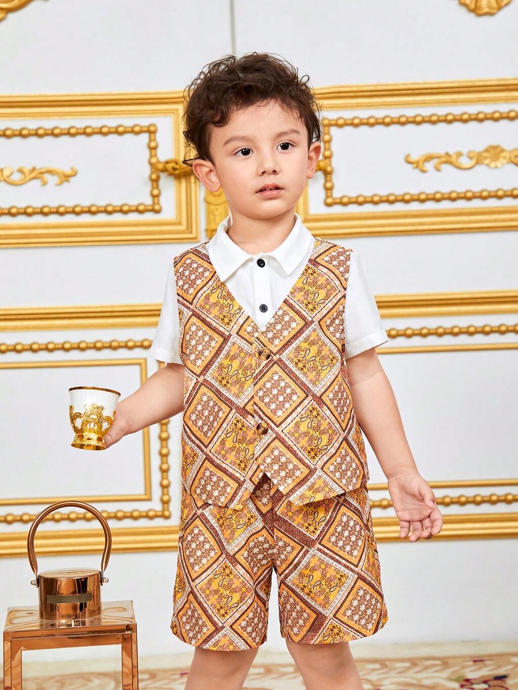 3 szt./zestaw chłopcy Elegancki garnitur , Zawierający Paisley Kołnierz Krótki Rękaw Koszula , Kamizelka Z Nadruk , I Szorty