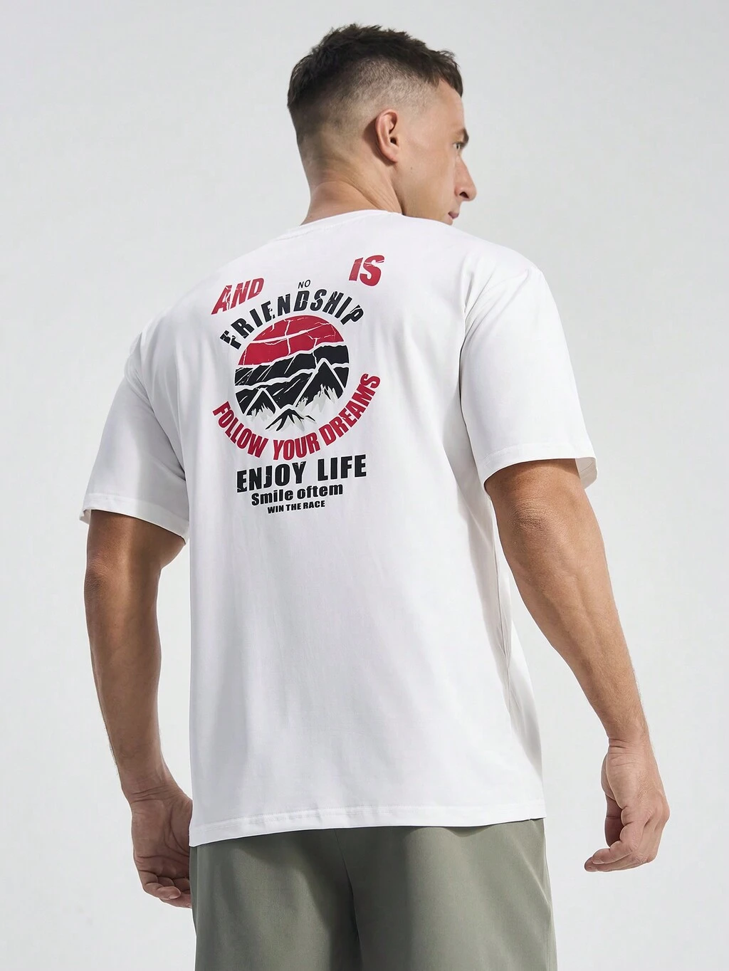 Camiseta Esportiva de Manga Curta com Estampa de Montanha e Slogan, Estilo Boyfriend para Homens
