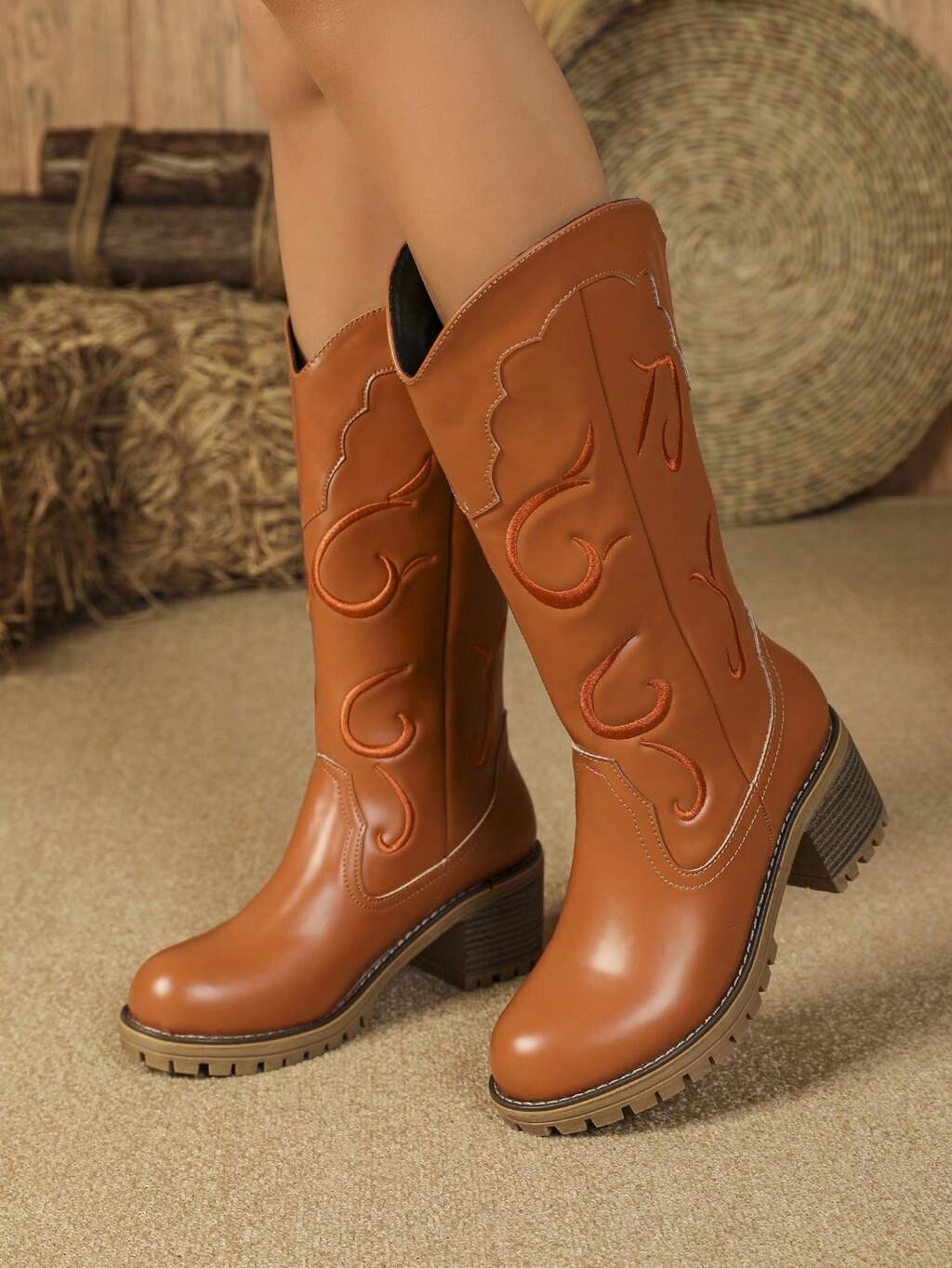 Mulheres Cowboy Ocidental Botas Bezerro Médio Cavaleiro Botas Dedo Do Pé Redondo Vintage Bordado Grosso Salto