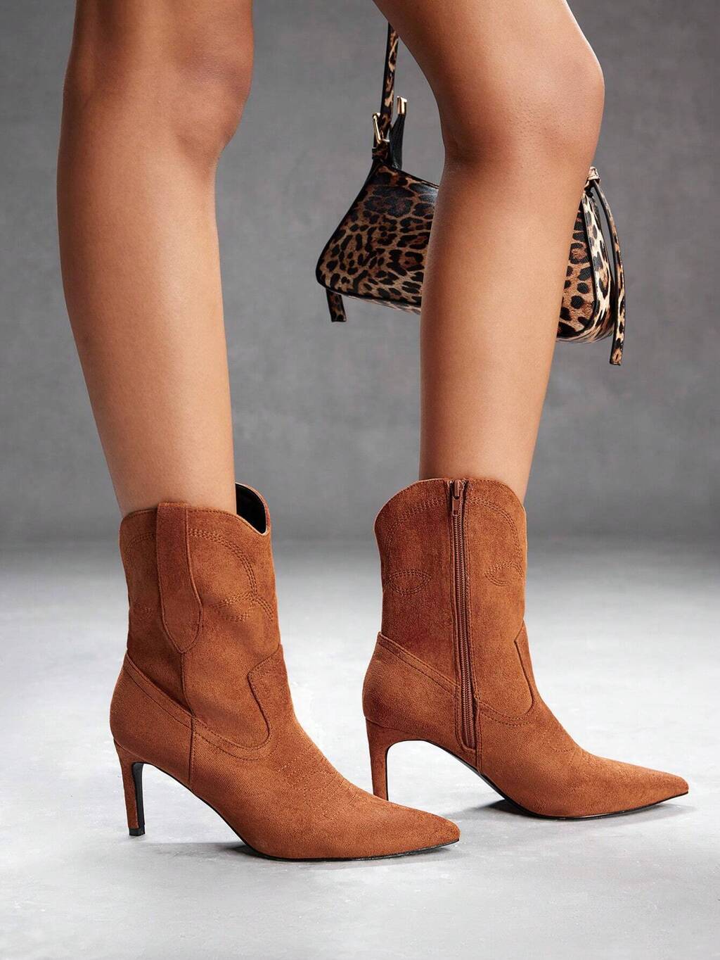 Bota Ocidental de Bico Fino, Tipo Cano Curto com Salto Alto Robusto em Design Bordado e Camurça para Usar com Cardigã, Estilo de Corselet para Outono/Inverno, Feminino