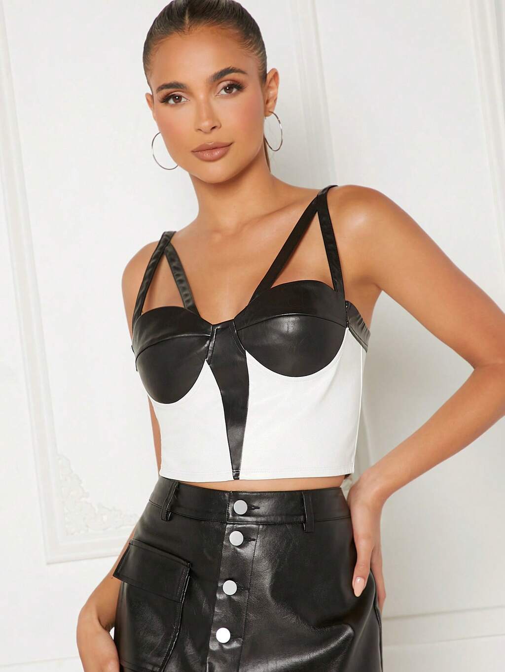 Blusa De Couro Pu De Contraste Em Duas Cores Com Borda De Lenço E Corte Cortado
