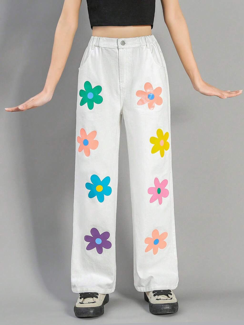 Jeans Retos Solto Confortáveis Com Estampa Floral Para Adolescentes